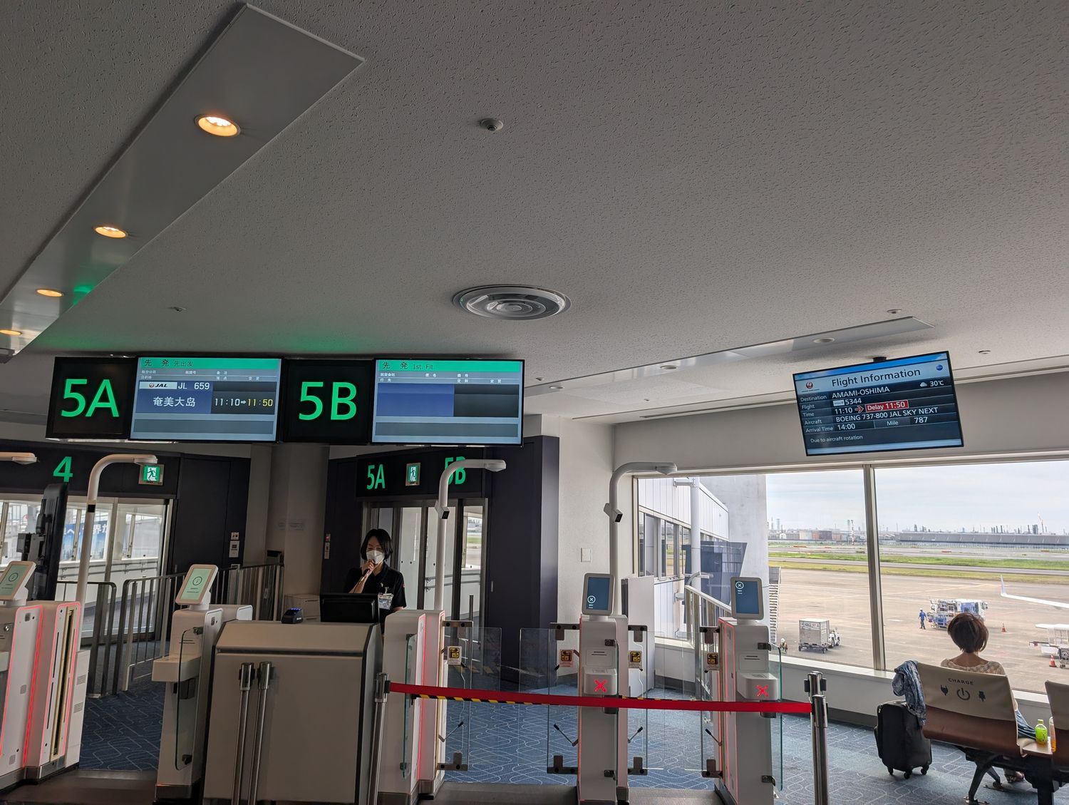 のんびりと静かなバスラウンジでランチのサンドイッチを食べ終えてから、ゆっくりと搭乗口へ。奄美行きは満席らしく、搭乗口付近の椅子はほぼ埋まってました。 |