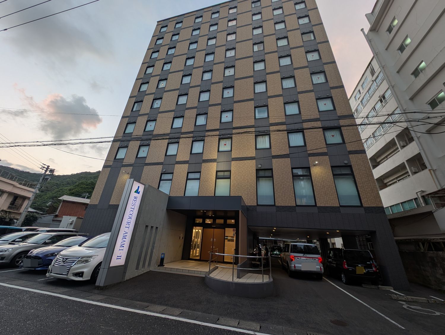 バス停の目と鼻の先にあるのが、今宵のお宿「ホテルウエストコート奄美2」。2とあるように、姉妹館として「1」と「WA-TERRASE」の3つのホテルがあるようです。 |