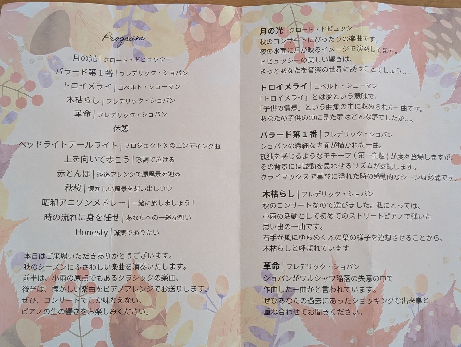 前半はオーソドックスなクラシックの有名どころから秋に因んだ曲が並んでます。「こう見えてもピアニストです」とツイートでしばしば強調されているとおり演奏技術は素晴らしいものがあるのですが、特に弱く繊細な音を紡ぐのが得意な小雨さん。そして演奏中の手の動きがとても美しかったですねぇ。1曲目の月の光や4曲目の木枯らしは本当に素晴らしい演奏でした。