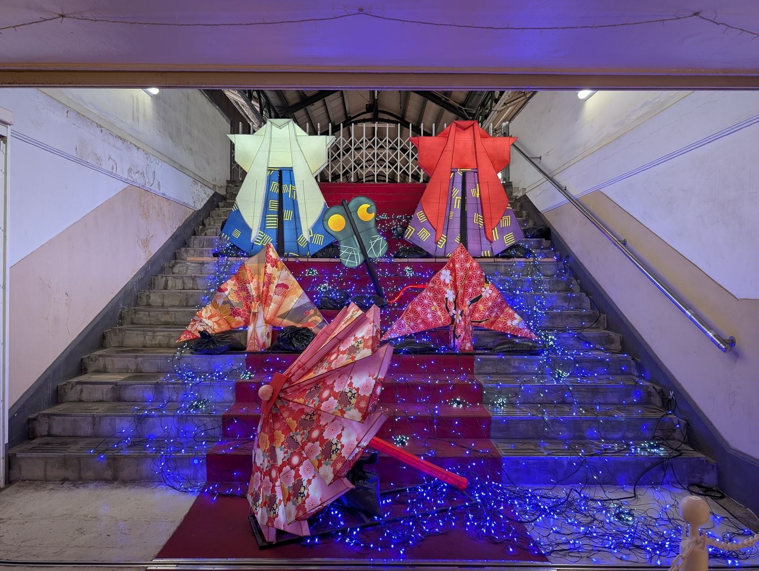 通路からホームへ上がる階段には、ご覧のようなこの時期らしいデコレーション。 |