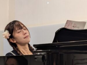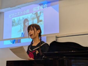 練習の後、キーを返してからファンミーティング開場となる5階のスタジオへ。こちらは15畳ほどある広い部屋の片隅にステージがあって、そこにヤマハC3ピアノが鎮座しています。20人ほどのミニコンサート向けの部屋ですね。 小雨さんはファンを「保護者さん」と呼んでいるようでして、なので今日のミーティングのタイトルは「保護者会」。トレードマークのセーラー服姿で小雨さんが登場すると、まずは「成績発表」と称して昨年度のYoutube動画の視聴実績と分析結果の発表、続いて今後の活動方針についてのグループワーク・・・まさに「保護者会」です。 |
