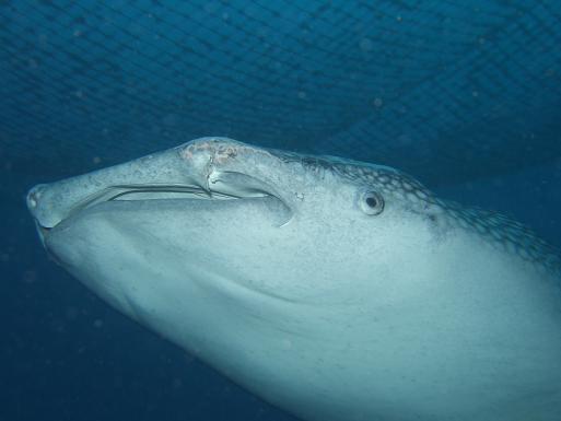 なにしろ,英名が「Whale Shark」ってんだから… 「サメ」といっても,性格は極めておとなしい。エサもオキアミやプランクトンで, 人を襲うことはない。 その大きさゆえにダイバーの憧れであるが,モルディヴなどでしばしば見かけられる 程度である。ただ,最近は沖縄の美ら海水族館で飼育されているほか,上記の 読谷村の定置網で飼育されており,見物などが可能である。 (右の写真も同じ個体) |