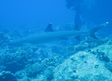 第一背鰭と尾鰭の各先端が白くなるので英名は"Whitetip reef shark"。日本でも正式和名より 「ホワイトチップ」という通称の方が有名かも。一応おとなしいサメと言われており特に昼間は 寝ていて動きも鈍いので近寄っても安全…だそうだけど,大きさは小型とはいえ2mになり「メジロザメ科」 であることから,彼が本気を出したらこっちの命は危ない。ケンカを売るのは避けたほうがよさそうである。 英名のとおり沿岸のサンゴ礁に住みついており,沖縄本島や慶良間諸島では日中岩陰で数匹の群れが寝ている 姿がしょっちゅう目撃されているようだが,久米島ではトンバラやイマズニという潮通しの良い外洋性ポイントで見かける。 しかも,なぜか群れでなく単独個体ばかり。なぜだろう? (右の写真:2010/08/03 久米島,トンバラにて) |