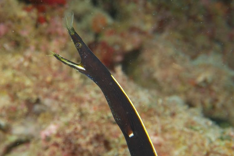 上の写真は幼魚。 ご覧のとおり真っ黒な体色でオトナとまったく異なります。なお、雄性先熟で幼魚から冒頭の写真の青色までがオス、そこから更に成長すると体色は黄色一色のメスになるそうですが、ソレはまだ見たことないなぁ。