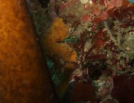 伊豆あたりで一番よく見かけるタツノオトシゴの仲間。 海草に絡んでいたりすると,見事な擬態でなかなか見つからないし,デジカメの画面上で 探すのも一苦労したりする。 ところで,ある日葉山で潜ったときのこと。 この日は津波のうねりが入っていて,特に浅場でのうねりがすさまじかった。 右の写真のハナタツくんは,そのときのもの。 水深3mくらいのところでカジメにつかまっていたんだけど,あまりのうねりに 吹っ飛ばされて,慌てて別のカジメにつかまっていた。 ちょっと,慌てた感じの表情がかわいかった! (右の写真:2009/01/13 葉山,芝崎にて) |