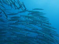 エントリーしたら,いきなり登場したのがこのホソカマスさんの群れ。 久米島ではいわゆるバラクーダ(オニカマス)は稀で,群れで登場するのは このホソカマスさんなんだとか。 さすがに,これだけの群れが登場するとオニカマスじゃなくても迫力は十分。 ただ,いわゆる「光り物」だけに正面からストロボを焚いちゃうと↑のような 失敗作になっちゃいます。ストロボは遠くから斜めに照らすか,光を弱めに しとかなきゃね。 今度は気を付けよう…