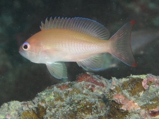 ケラマハナダイはオスもメスも扇形の尾びれは共通。んでもって,オスのように背びれの赤い斑点がない代わりに 尾びれの上下の端っこに赤い斑紋があるんですね。