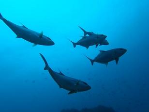 あまりの迫力にしばし呆然。我に返ったら,ひたすらシャッターを切る。 10分くらい写真を撮りまくっていたが,カンパチくん達はまったく逃げる気配が無く, 我々の周りをぐるぐると回ったり,私の吐いたエアと遊んだりと愛らしい。 彼らは,単にエアをエサと間違えていたのかもしれないけど。 「カンパチ」とは「間八」と書く。正面から見ると,眼の間の模様が「八」の字に 見えるからとか。ほんとかなぁ?試したこと無いけど。 ちなみに,親戚(?)のTHEカンパチとの違いは, ・尾びれの先端が,カンパチは白くヒレナガは黒い。 ・第2背びれと尻びれが,カンパチはさほど長くないが, ヒレナガは長く鎌状になっている(だからヒレナガ)。 ということらしい。 (右の写真:上の写真の子がいた群れ) |