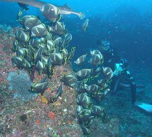 主に伊豆諸島から小笠原にかけて生息する日本固有種で,まれに伊豆半島でも目撃される らしいが,八丈島に行けば普通に見られる。 ユウゼンと言えば,右の写真のように初夏と秋に玉のような群れをつくる「ユウゼン玉」が有名。 玉になるのはなぜかは未だに謎。キホシスズメダイの卵を春と秋の繁殖期に栄養補給のため群れて パクつくため…という説をネットで見たことがあるけど,ここ数年の八丈島では年中ユウゼン玉が 見られていることから,この説も眉唾だなぁ。 (右の写真 2008/09/27 八丈島,ナズマドにて) |