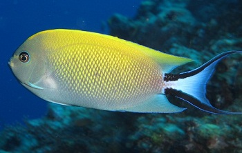 ウーマガイのドロップオフ周辺で見かけた子。 ヤッコ系って岩陰をうろちょろしているってイメージがあるけど,この子やヒレナガヤッコなんかは 堂々と中層を泳ぎまくっていました。まあ,朝イチの時間帯だからお食事に夢中だっただけかも しれないけどね。 ↑の子が雄で,→の子が雌。 タテジマヤッコ属の子たちって,雄雌で全然デザインが違うのね。 レアものってほどじゃないにしても,たまーに見かけるというくらいらしいです。 (右の写真:2011/08/02 久米島,ウーマガイにて)