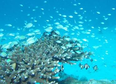 熱帯の珊瑚礁で潜ると,まず目に付くのがこの子達。 リゾート地で体験ダイビングをしたときにこの子達の美しさに魅了され, ダイバーになった人も多いだろう。 10cmくらいになる成魚(上の写真)もそこそこキレイだが, それよりも浅場で群れている幼魚(右の写真)たちの方がもっと美しい。 一見ランダムに群れているように見えるが,時折さっとサンゴの隙間に 逃げ込み,また花開くようにサンゴの周りを泳ぎ出す。 その秩序だった動きは,ずっと眺めていても飽きが来ない。 (右の写真:2008/02/15 唐馬No.2(慶良間・座間味島)にて) |