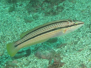 葉山では普通種。そこらじゅうにいます。 なのにこのHPへの掲載が遅れたのは…ワタシのベラへの苦手意識がめっちゃ強いから,ですかね。この子もそうだけど, ベラってホンマにちょこまか動き回って撮りづらい! 雌雄の色彩差が激しくて,↑の子はオス。そしてメスはこちら(→)。「キュウセン」って名の由来はメスの身体に 黒と赤の線が合計9本走っているから,らしいです。なんて安直なネーミング…