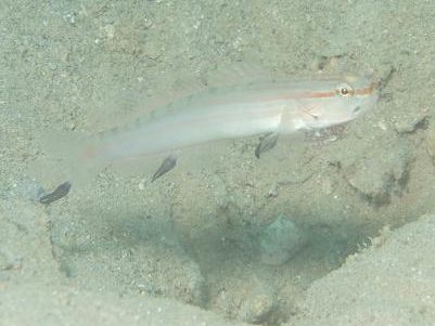 こちらも同じレッドビーチで見かけた子なんだけど・・・よく見ると(見なくても,か。)何やら黒いモノがぺたぺたとくっついてる… これ,スミゾメキヌハダウミウシというウミウシ。 キヌハダウミウシの仲間はたいてい他の後鰓類がエサなんだけど,この子だけは底生のハゼの ヒレを食べるという何とも迷惑な種類なんだとか。テッポウエビの巣穴で共生するという性質を 見事に逆手に取ったのね。