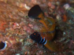 冬はヒメギンポのブライダルシーズンで,右の写真のように鮮やかな 婚姻色に染まった姿を見ることができる。ちなみに,この写真を撮った ときは,まさか上の写真(メスの通常色)と同じ種類とは知らず,あとで 知ってビックリしたものである。