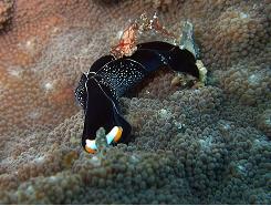八重根で安全停止中に,偶然はい回っている彼を発見。 そのころはまだツバメガイ系のウミウシを知らなかったので,何やら分からんけどキレイだから という理由だけで写真を撮っておいた。 後になって希種ということが分かり,小躍りしたのは言うまでもない。 同時に,身体の上のゴミを払ってから撮れば良かったと歯がみをしたのも,また言うまでもなかろう。