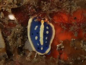 ウミウシの代表格とも言うべきウミウシ。 伊豆で潜れば,必ずと言っていいくらいに見かけるし,姿形も「いかにもウミウシ」。 大きくなるとイマイチだけど,ミリ単位の小さいものだとそれなりにかわいげもあって,ワタシも 決して嫌いじゃない。 ところで,右の写真を撮ったあとで「これなあに」とガイドに聞いてしまった。 時としてこのように平べったくなることを知らなかった頃のことでございます… (右の写真:2006/12/09 葉山,芝崎にて)