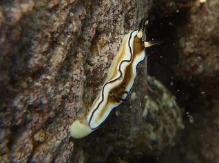 ところで,初めて会ったのは八丈島の乙千代ヶ浜タイドプール。 夏には子供達がプール代わりに遊ぶという水深1mもないところで,コンシボリや ベニシボリの撮影の合間にちょいと見つけた「おまけ」でした。 右の子がそのとき見つけた子なんだけど,大して印象もなく,まあ地味な ウミウシだなくらいのものだったんだけど… 上の子に会ってちょっと株価上昇。 外套膜のヒダヒダがなかなかシックで綺麗じゃない! やっぱり,1個体だけで「好き嫌い」を決めるのは良くないですね。 (右の写真:2007/01/27 八丈島,乙千代ヶ浜(中)にて)