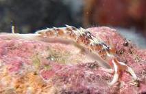 ネットで見つけた富山の個体写真や「本州のウミウシ」に載っている八丈島の個体写真では だと「緋房」に例えられるオレンジ色の背面突起が鮮やかなんだけど,「沖縄のウミウシ」に 載っている写真はこの子のように地味〜な色彩。 (右の写真:2008/02/13 沖縄本島,金武レッドビーチにて)