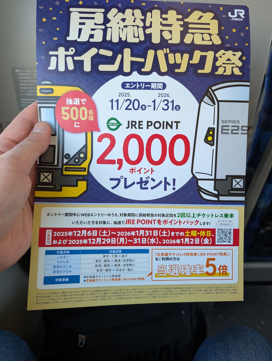 JRさんも閑散期と見込んでいたのか、シートポケットにこんなチラシが入ってました。東京~勝浦を往復すれば応募できるみたい。これだけ客が少なかったら倍率も低そうです(笑)