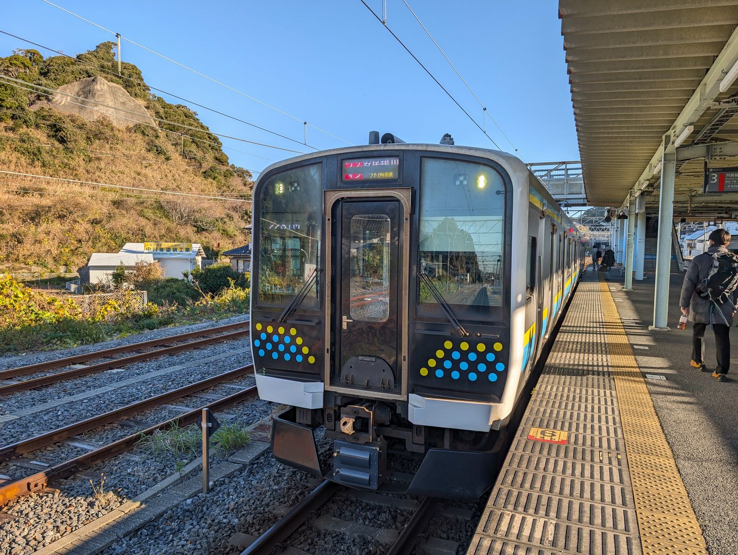 終点の勝浦駅で、いつものように普通列車へお乗り換え。待っていたのはE131系の80番台。房総地区用の0番台に線路設備モニタリング装置を搭載したもので、その分床下に配置できなかった機器が2人掛けシートを潰す形で車内を圧迫しています。