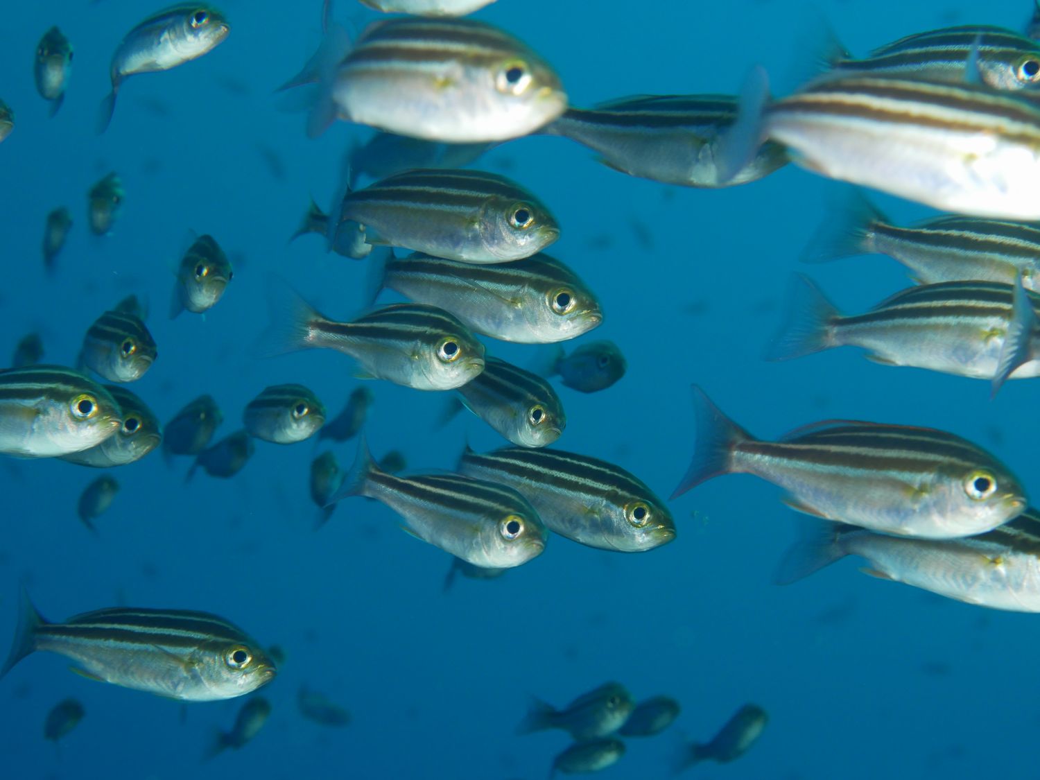 そして、ウマノセらしくそこかしこに魚の大群が。特にこのイサキさん(Parapristipoma trilineatum)の群れが凄かった。