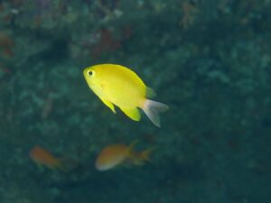 ここ数年、沖縄で潜ることが多くなったせいか温帯種を「珍しい」なんて思っちゃうワタクシ。このコガネスズメダイさん(Chromis albicauda)は関東の海では普通種なのですが、沖縄かぶれのワタクシはヤマブキスズメダイさんのほうが馴染みがあります(笑)
