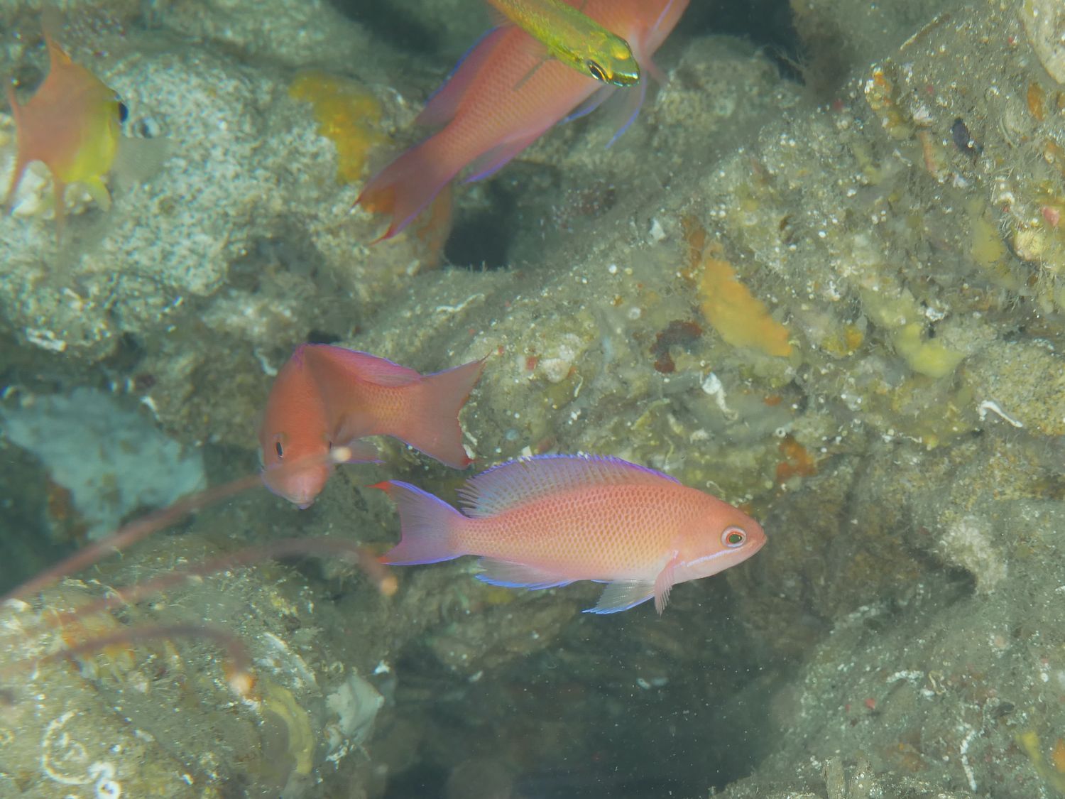 根の陰にはアカオビハナダイさん(Pseudanthias rubrizonatus)の子供たちが群れてます。ただオスの姿はなく・・・ちょっと寂しいです。