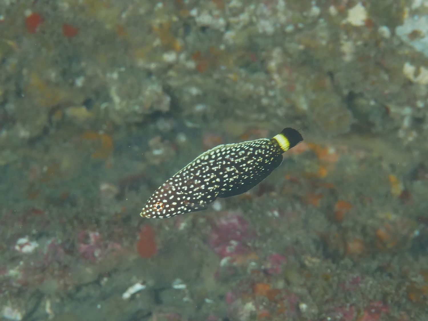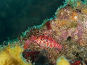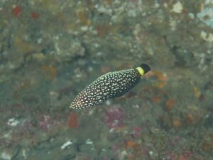 ゆっくりと根の縁を泳いでるときに見かけたヒメゴンベさん(Cirrhitichthys oxycephalus)。この方もいわゆる季節来遊魚なので、そろそろ水の冷たさが身に沁みてきたころかしらん。