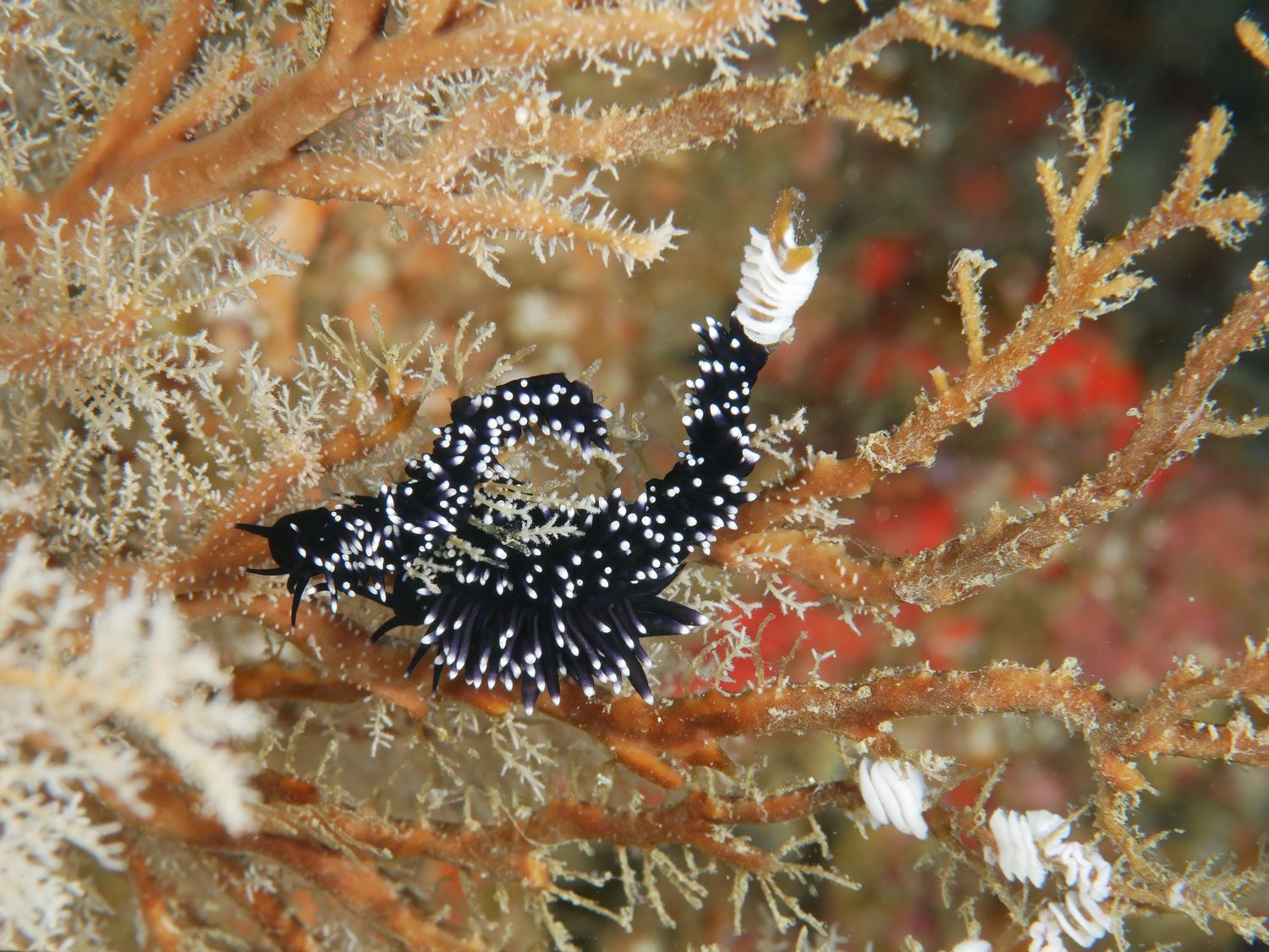 オウギウミヒドラにいたスミゾメミノウミウシさん(Protaeolidiella atra)。せっせと次々に卵を産み付けてます。