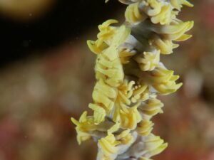 根の下にあるムチカラマツには、いつもムチカラマツエビさん(Pontonides loloata)がいらっしゃるのですが、この子もけっこう臆病でカメラを近づけるとスイスイと逃げちゃいます。