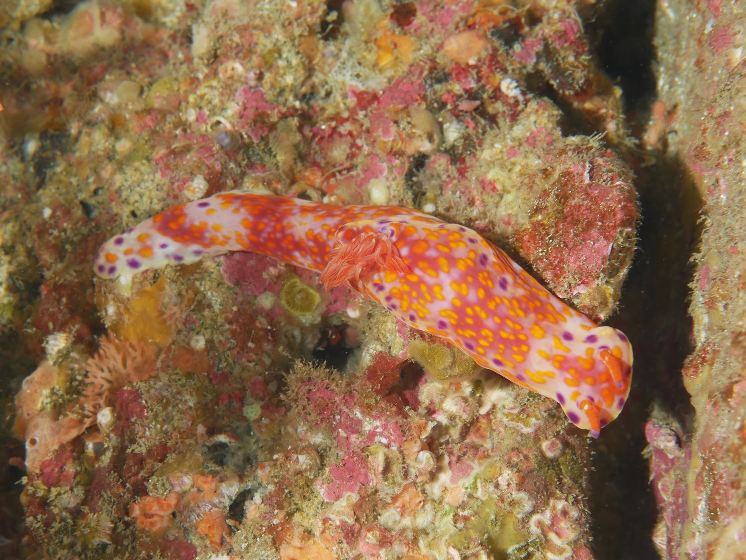 手のひらサイズのニシキウミウシさん(Ceratosoma trilobatum)はそこかしこで見かけました。