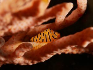 一緒に潜っていた他店のゲストさんに教えてもらったトラフケボリさん(Cuspivolva tigris)。学名のとおりタイガースカラーがかっこいいです。