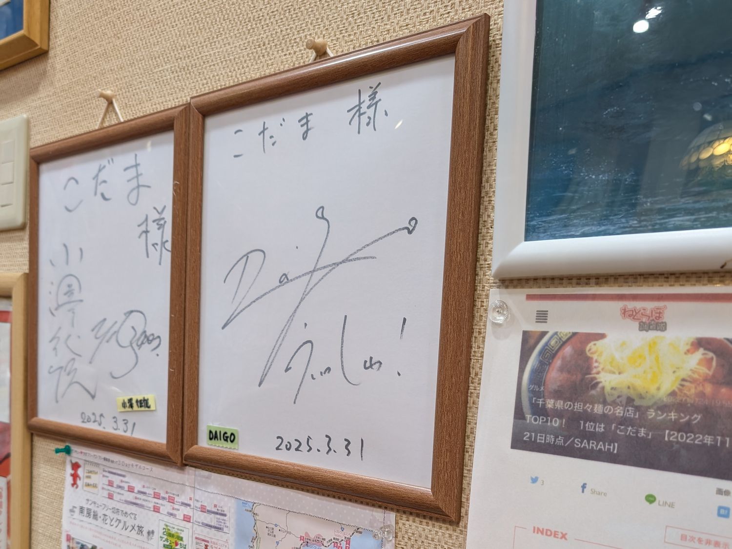 このお店、有名人がお忍びでよく来るようで、壁には所狭しとサイン色紙が飾られてます。DAIGOさんと小澤征悦さんが春先の旅番組のときにいらっしゃったときの色紙も。そういえばこの二人は遠縁の親戚なんでしたっけ。