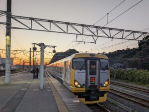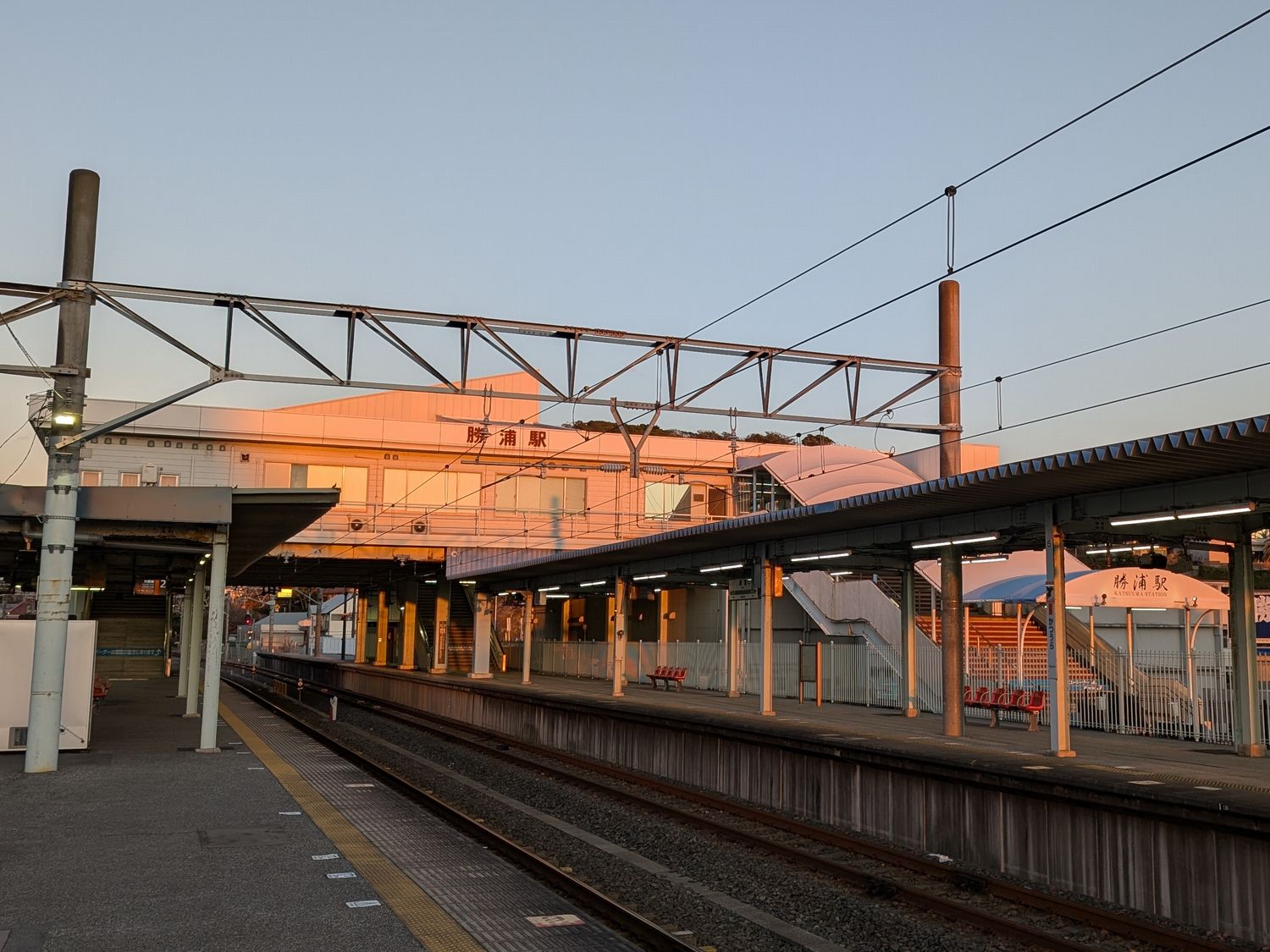 サービスで荷物をまとめて、勝浦駅まで送ってもらいました。夕陽に染まった駅ってきれいですね。