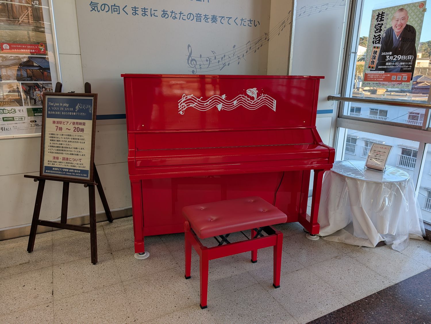 この駅、正月の弾き初めで弾いた白い駅ピアノがあるんです。