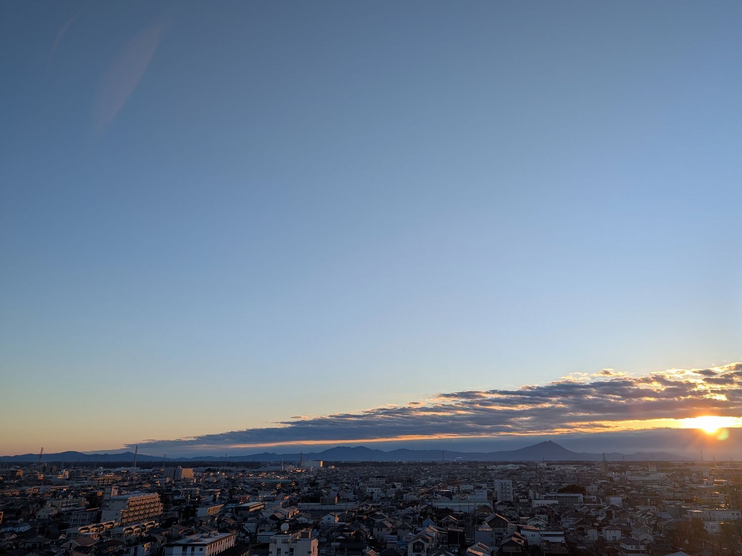 北関東の新年の朝は晴れ。地平線近くに雲があったのですが、雲の隙間からギリギリ初日の出を拝むことができました。