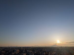 この写真、ウチのマンションの北側にある廊下から撮っているのですが、つい先週くらいまでは日の出の位置が南側に偏っていて、スマホのピント合わせの都合上マンションの建物ごと撮らざるをえなかったんです。あとはパソコンで建物を削るようなトリミングをしてリサイズ。